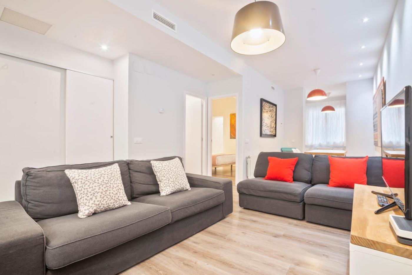 The apartment at Barcelona Eixample has air conditioning and parquet flooring. It has a lounge area with sofa and TV; and a modern kitchen equipped with a dishwasher and kitchenware. There are 2 bathrooms. A washing machine and cleaning products are provided.