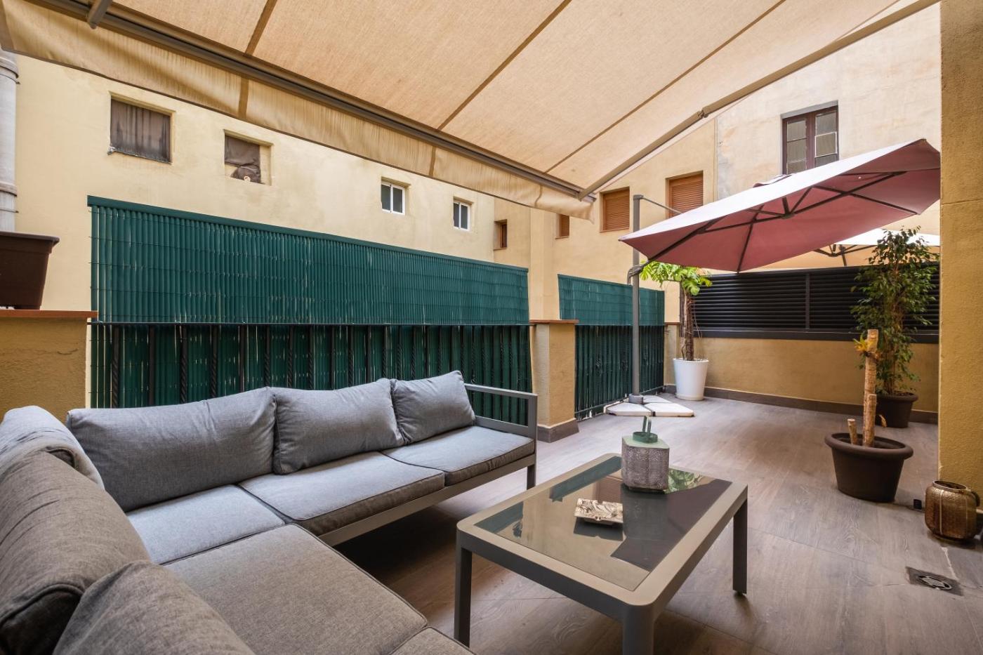 Luxury Suite with Terrace - Gothic Quarter. High level classic-style apartment with 2 suite-bedrooms (2 x king-size bed), 2 bathrooms (shower), living room and 2 dining areas and large private terrace. The apartments also have air conditioning, heating, Smart LED TV, free Wi-Fi and a well-equipped kitchen with washing machine, Nespresso coffee, dishwasher and refrigerator. The bathroom has a hairdryer. Apartament - 4 osobowy. Powierzchnia pokoju ok.: 84 mkw. ;
