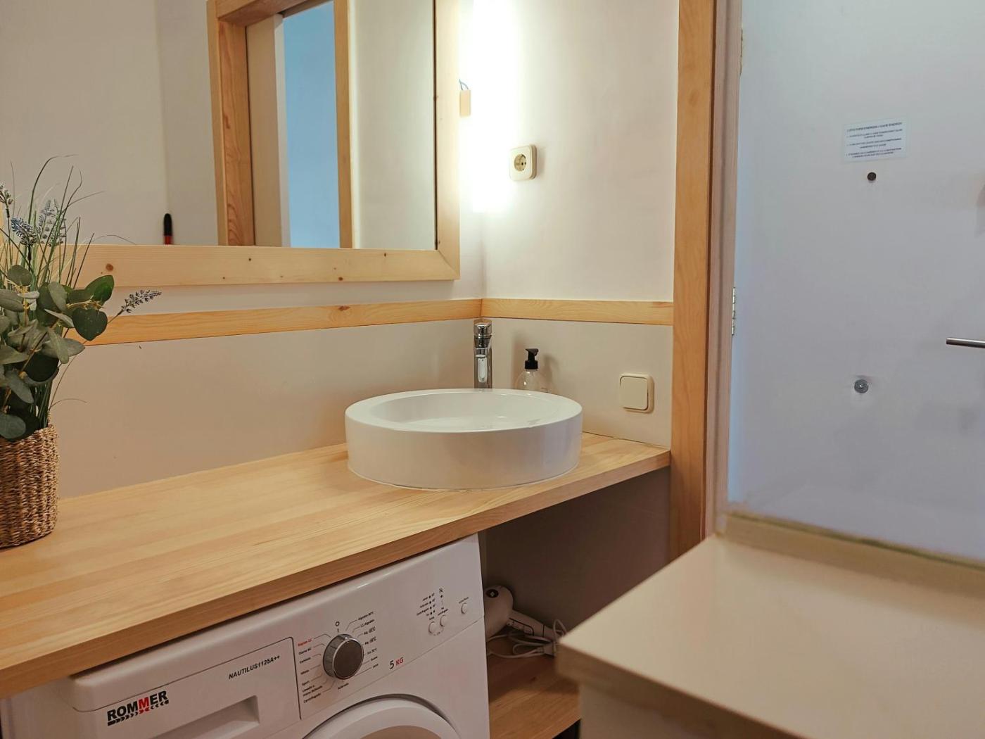 W apartamencie do dyspozycji gości przygotowano sypialnię (1), kuchnię ze standardowym wyposażeniem, a także łazienkę (1) z prysznicem. Wyposażenie obejmuje także pralkę oraz telewizor. W apartamencie zapewniono ręczniki i pościel.